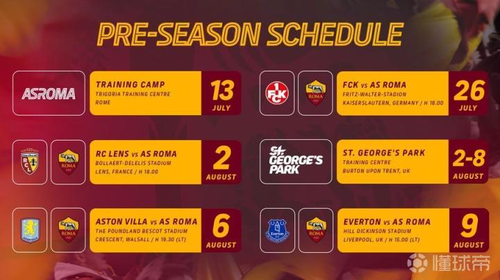 随后,罗马将启程前往英格兰,在伯顿的圣乔治公园训练基地展开为期一周的集训,为新赛季做准备。期间,他们将在8月6日19:30造访贝斯科特体育场,与阿斯顿维拉进行一场激烈的比赛。